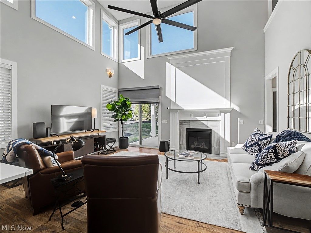 Better than new and ready now! This beautifully upgraded end-unit townhome in desirable 55+ Tuscan Village, truly looks and lives like a model home?no expense spared and thoughtfully enhanced from top to bottom. Why wait to build when this move-in-ready home is already complete? This stunning condo is the Emilia floor plan by Parkview Homes, offering the perfect blend of style, comfort, and functionality. Designed with a highly sought-after first-floor primary bedroom, the open-concept main level features engineered wood flooring, a dramatic two-story great room, and expansive windows that fill the space with natural light. The kitchen offers a high-end appliance package, quality finishes, and a layout that is both functional and stylish for everyday living and entertaining. Upgrades extend throughout the home, including modern, designer lighting fixtures and enhanced electrical switches. Comfort and efficiency are elevated with high-end, high-efficiency HVAC components, offering peace of mind and long-term value. The patio is wired for electric and equipped with a natural gas line, ideal for grilling or future outdoor enhancements. As an end unit, the home benefits from additional windows and an airy, open feel. The upper level provides two additional bedrooms with walk-in closets, two flexible loft areas, and a full bathroom with dual vanity/sinks, perfect for guests, hobbies, or work-from-home needs. This is a rare opportunity to own a turnkey home that competes directly with new construction?without the wait?in a prime eastern Avon Lake location. Potentially available fully furnished for fast move in! Be sure to check out the 3D tour!
